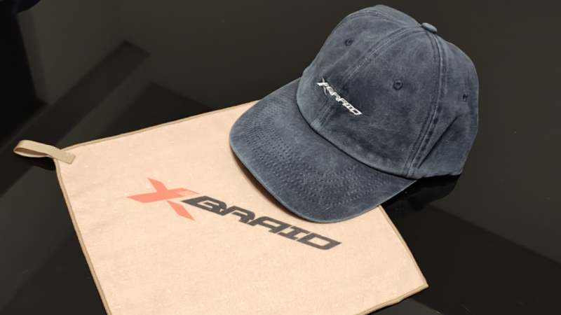 XBRAIDブースでは、アンケートに答えることでロゴが刺繍されたキャップを